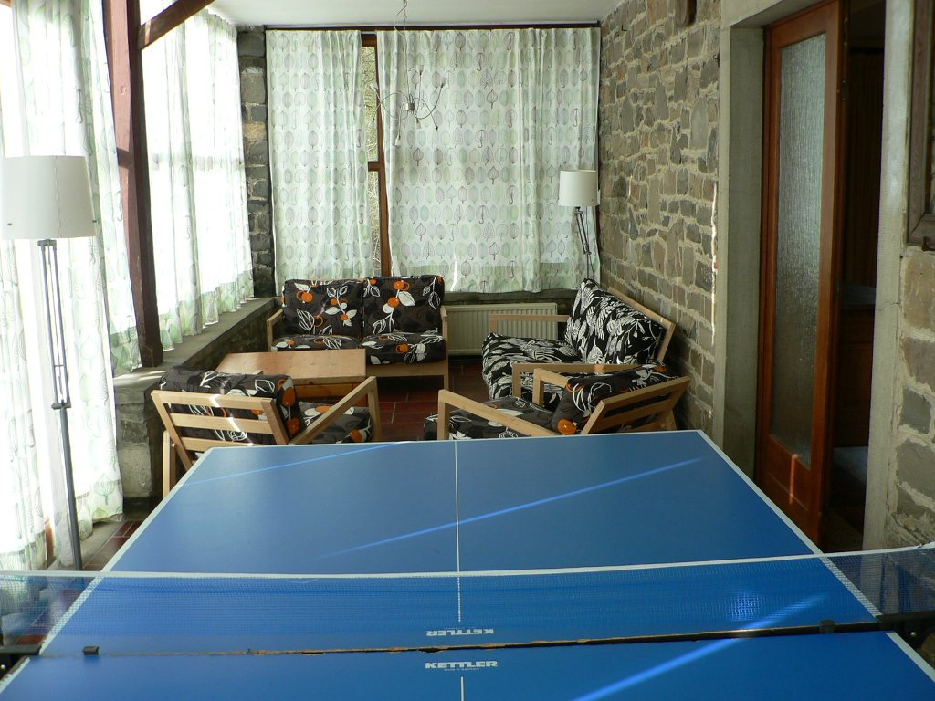 De serre met een knusse zithoek en pingpongtafel.