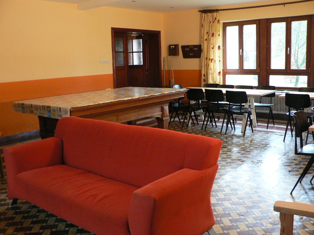 De woonkamer met zithoek, biljart en 3 grote tafels.