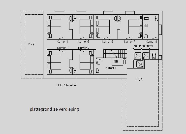 Op de gangen bevinden zich de gezamenlijke toiletten en de douches.